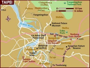 Taipei, es una ciudad que está en una isla, pero no llega a ser costera. Está atravesada por el rio Danshui, que tiene varios afluentes que se le unen en la propia ciudad y un par de giros que hacen que el mapa de ésta se vea bastante azul :). La ciudad se encuentra entre dos zonas montañosas (algo alejadas) y en una de ellas hay un volcán extinto.